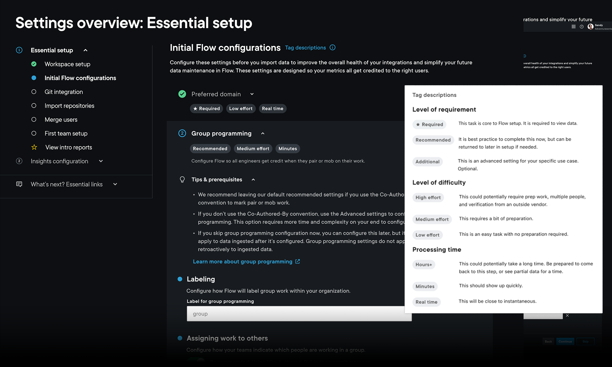 A key component of this initiative was designing a tagging system for each configuration requirement. Each tag clearly communicates to the customer the criticality of each configuration, the effort required, and the estimated time to complete. This system was extremely well received and is now being adopted across all of Settings in Flow. The result is a significantly clearer, more scalable configuration experience that reduces friction for customers, sets realistic expectations for the experience, and lowers reliance on Flow employees and support teams.
